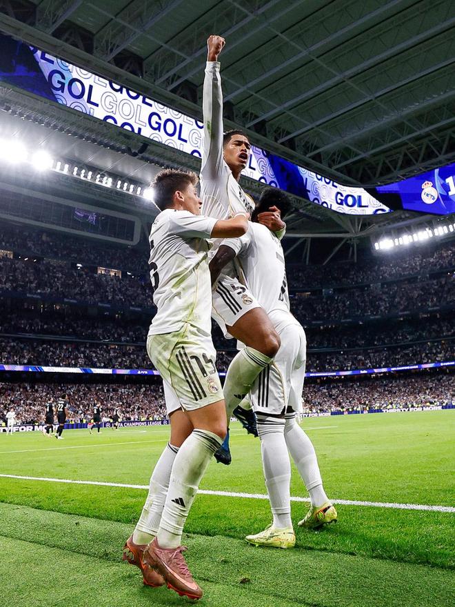 易边再战,第57分钟,威尼修斯禁区内小角度打门击中立柱弹回场内,贝林厄姆火速插上捡漏补射得手,皇马1-0领先,下半场早早就取得了梦幻般开局;值得一提的是,这是身价1.8亿欧的英格兰中场本赛季为皇马打入的处子球,他振臂怒吼疯狂庆祝。